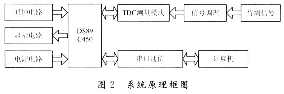 当系统上电后,通过DS89C450单片机对TDC—GPl芯片进行工作通道、工作模式选择等初始化操作。当接收到经信号调理后的时差信号后,TDC—GPl按照预先的设置开始工作并将测量的结果存储在相应的结果寄存器中。当测量结束后,单片机读取测量结果并按照量程2中的时差计算公式完成相关的数据处理及显示等功能。