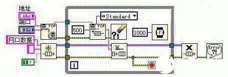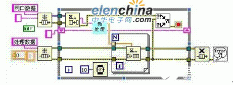 首先用“打开TCP连接”函数打开由地址和远程端口所指定的TCP网络连接,同时用“获取队列引用”函数创建以名为“网口数据”的队列,再用“读取TCP数据”函数从TCP网络连接读取字节,并把字节放入“网口数据”队列中,等待数据处理循环读取队列中数据,同时开始采集下一秒的数据。