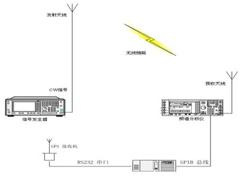 测量系统包括发射端和接收端两部分,如图2所示。发射端由信号发生器、功率放大器和发射天线组成。Agilent ESG信号发生器产生3.5GHz CW测量信号,发射端的功率放大器用于扩展测量范围。接收端由频谱分析仪、控制计算机和GPS接收机系统组成。Agilent PSA频谱分析仪具有低噪声、高采样率的特点,GPS接收机采样点的地理坐标。