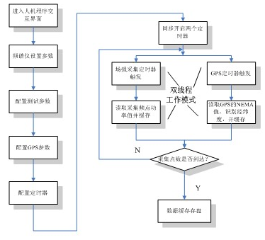 采集系统包括频谱分析仪配置,场强采集和GPS信息同步采集与数据存储等一系列流程。模块程序流程图如3所示: