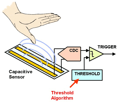 在大多数情形下,接近传感器由电路板上的两个导体构成,中间的介质具有非常低的介电常数(接近1)。如果一个物体—如手—移动到该电容的电场之中,电容就会发生变化。巨大的人体由90%以上的水份构成,因此,具有非常高的介电常数(大约为50)。