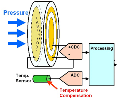 温度传感器因为存在热膨胀,需要考虑已改变的几何尺寸。如果两个电极之一被连接到芯片上,而另一个电极做在由金属或陶瓷构成的外壳上,外壳本身因此起到传感器的作用。例如,陶瓷传感器可以承受非常高的压力和迅速蔓延的媒介。与典型的惠斯通电桥相比,电容压力传感器的主要优点是要求小的输入电流,使它们特别适合于诸如胎压控制之类的应用。