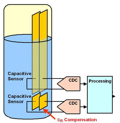 在液位传感器中,一对固定的极板被浸入液体中待测。制造商能够以非常低的成本实现印刷导体。第二对极板被附着在底部区域,让电介质因温度或其它被检测效应而变化,如下图所示。