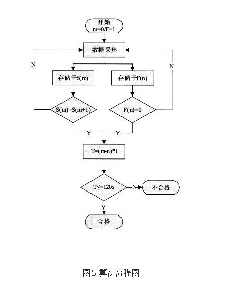 根据电梯检测规程要求,缓冲器从全压缩到复位的时间应不大于120秒。上位机从上电检测开始每隔0.1秒发送数据采集命令,并将返回的距离值和开关量信号存储于不同的数组待分析。数组s(m)和F(n)分别存储采集到的距离值和开关信号值(0或1),t为每次数据采集循环时间,T为缓冲器回复时间。软件的算法流程图如5所示: