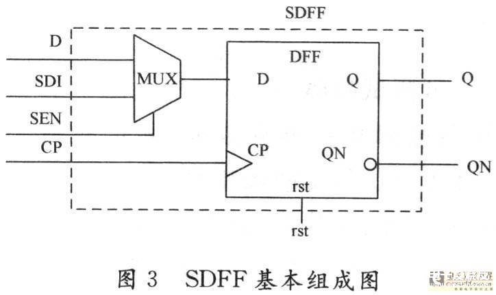 图2中虚线部分为扫描触发器,即扫描链的基本组成单元,其构成原理如图3所示。