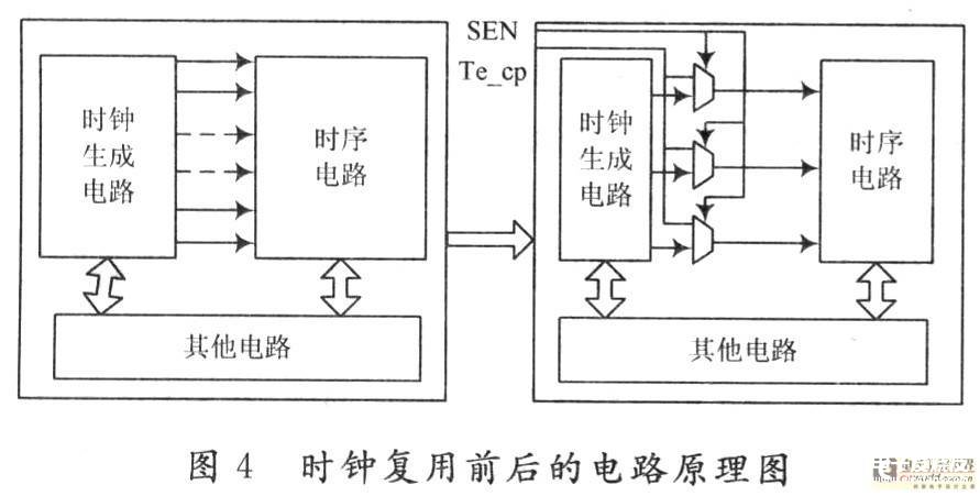 从图中可以看出,时钟电路产生很多不同频率的时钟以满足不同模块的需求,在时钟电路的输出端口加入相应的选择器(MUX)控制时钟的选择;当处于正常工作状态时,MUX选择正常的时钟进入相应的模块,进而实现相应的功能;当处于扫描状态时,这些MUX都是选择同样的扫描测试时钟信号(Te cp)进人到各个模块进行测试。这样做的优点在于不仅满足了测试选择的需要,而且也尽可能地测试到所有触发器,满足测试覆盖率的需要。