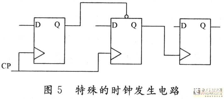 在本设计中存在很多特殊的电路,其中有一种时钟发生电路是不能进行扫描路径法的可测性设计,具体的电路图如图5所示。