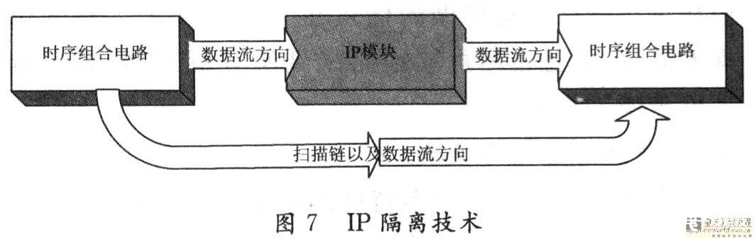通过此种方法可以有效地将一个或多个类似的IP模块与原电路软隔离开。当电路工作在非扫描状态下,数据按照正常的数据流方向流、进流出IP模块;当电路工作在扫描状态时,扫描数据绕过相应1P模块,按照相应的扫描链路径流进下级时序电路部分,实现扫描测试的功能。