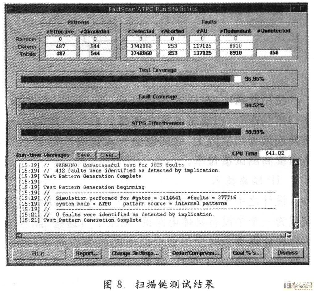 从图8可以看出,当采用了以上设计策略后测试覆盖率(test coverage)、故障覆盖率(fault coverage)和ATPG覆盖率分别达到96.95 9/6,94.52%和99.99%。