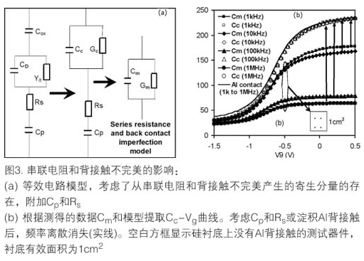 测得的电容可按照此模型校正而恢复,与测量频率无关,如图3(b)所示。串联电阻影响则可直接用在衬底背面淀积Al膜减至最小(图2(b)中的空心符号和图3(b)中的实线)。这表明,一旦考虑寄生分量时,有可能决定无误差的电容真值,保持测量系统的可靠性。