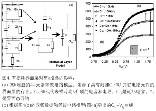 再研究高k MOS电路上损耗界面层的影响。在图1(b)中,要注意频率离散不是串联电阻影响引起的(因为此样品采用了有效面积大的衬底和Al背接触)。图1(a)中看到的频率离散缺失则可用高k层和界面层的相对厚度解释。图1(a)样品的界面层厚度(~1nm)与电容等效厚度(CET)~21nm比较可以忽略不计,这种情况下,高k层电容比界面层电容小得多(即Ch《《Ci)。但对于图1(b)的样品,尽管有Al背接触和较大的衬底面积,频率离散影响仍是很大的。此时Ch与Ci相当,将频率离散影响归因于界面层电容内的损耗(假定原始SiO2为~1nm),其中,缺陷是由界面位错和ZrO2/SiO2化学突变界面处键合配位中的固有差异引起的。