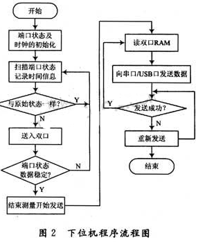 为了降低数据通讯对系统资源的占用,提高系统监测的实时性,采用另一CPU负责与上位机进行数据通讯,通信CPU通过串口或USB口与上位机进行连接。通讯过程如下:当系统监测到1次事件触发后,通讯CPU从双口RAM中读出数据,将数据通过串口或USB口发给上位机。