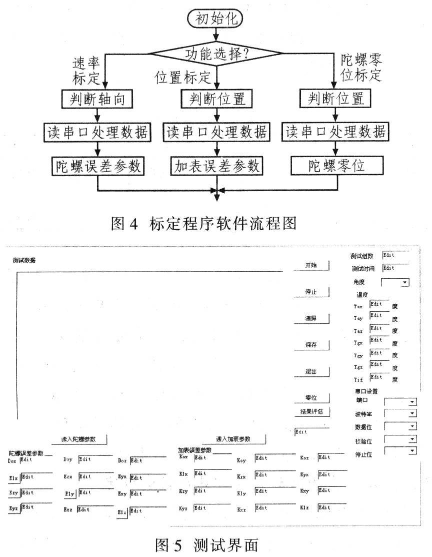 标定测试共分为3步:①位置标定,完成对加速度计的标定;②速率标定,标定陀螺的安装误差和标度因数;(9陀螺常值标定。图4为总程序设计流程。按照图4的流程,设计图5所示的测试软件。设计中首先判断功能.选择所需的功能,只需设置3个标志符,每个标志符对应相应的功能。具体测试功能中,建立3个类,各个类编写各自的测试功能。位置标定时,由于位置比较多,对每一个位置都应设置各自的标志符,采集到的数据存储在内存中固定位置。这样处理数据时只需读取相应位置,避免误操作,缩短操作时间。在速率标定时,设置3个全局变量分别表示3个轴,同时在补测时,可直接将旧数据覆盖新数据。陀螺零位测试时,由于测试时间较长,在测试初始化中需占用的数组存储空间较大,数据处理部分和位置标定差不多。图5是测试界面。