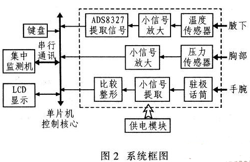 系统以单片机为控制核心,由提取体温、脉搏次数和呼吸间隔的传感器及相应的信号调理模块、放大整形模块、电源模块、键盘控制模块,以及LCD显示模块等构成。系统还包括一个可以与独立监测单片机进行串行通讯的集中监测机,用于对仪器设备进行网络化管理。系统具体实现框图如图2所示。