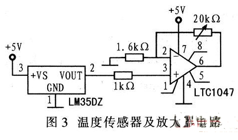 该电路采用美国国家半导体公司的LM35作为温度传感器,由于其输出电压较小,所以在后级加入了同相放大电路,运放采用超低噪声及失调电压的LTCl047。如图3所示。