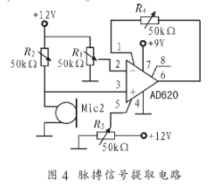 该电路由话筒及仪表放大器AD620组成。话筒将脉搏信号转换为电信号,仪表放大器AD620采用单电源供电,电位器R3用于调节2引脚的直流偏置,使其与3引脚的输入信号中的直流偏置相同,从而实现差分放大。其参考端5引脚通过电位器R4加上直流偏置,可以根据需要对输入信号在较大范围内进行放大。