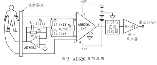 AD620的失调电压和失调电流小、共模抑制比高,其最大失调电压为50μV,最大失调电流为10 nA,最小共模抑制比为100 dB,所以对在微弱信号的处理,也就是放大和消除噪声方面有着比较优秀的品质,在仪表放大中应用较多,如简易心电仪、压力传感器、超声仪等。AD620还有一个偏置端,可输出带偏置的信号,也可用于程控放大等场合。AD620最典型的应用是心电信号检测,图4为心电信号检测电路中的AD620电路,其输入端(2、3引脚)接入的是一对差分信号。