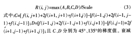 Sobel算子模板中的元素表示算式中相应像素的权重因子。Sobel算子是边缘检测算子,故其处理模板中各因子之和为零。另一方面,由于正因子和负因子之和分别为4和一4,在极端情况下处理结果可能溢出。因此,在实际使用时,Sobel算子通常采用已设定阈值进行二值化,即处理结果得到的是已二值化的边缘图。该结果将导致边缘图中幅值较小的边缘丢失。为了克服这个缺陷,引入一个衰减因子Scale,用它去除计算结果,来消除数据的溢出,而无需二值化处理,而且其结果是无失真的灰阶边缘图,从而保留所有边缘数值同。加入扩展的模板后可得: