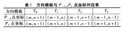 采用扩展的Sobel细化算子搜索单像素边缘,在搜索过程中,剔除边缘点梯度方向的非极大值,从而保证亚像像素细分定位的前提条件成立。方向模板与P-1,P1点坐标对应表如表1所示。