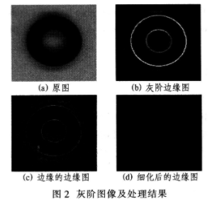 灰度图像细化处理步骤如下:①对灰度图像作带衰减因子的Sobel处理,得灰度边缘图。Sobel处理采用式(3);②对所得灰度边缘图再作带衰减因子的Sobel处理;③灰度边缘图减去Sobel处理结果,再将与负值部分对应的边缘点的值改为零,得到细化的边缘图。