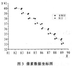 图3是在原边缘基础上取一段圆弧,对其细分前后的坐标图,可以看出,经过亚像素细分算法定位后得到的像素边缘比较光滑。相对于未细分,其精确度得到提高。
