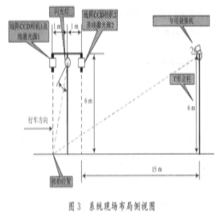 基于线阵CCD的交通信息采集和检测系统的主要设备包括:线阵CCD相机、线激光源、闪光灯、专用高分辨率摄像机和64位工控机,以上设备均安装在路段上。为了达到交通信息实时采集的要求,用户可以根据需要,设立多个检测断面。图2为本系统的一个检测断面。