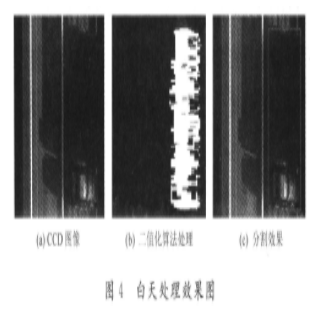 利用小波变换提取路面的纹理特征,然后对采集的每线数据进行二值化,并在此基础上,逐线进行车辆分割。图4(a)所示为白天采集的线阵CCD图像,由于太阳照射的影响,图像中存在车辆阴影。采用基于图像纹理特征的二值化算法处理效果如图4(b)所示,去除了阴影的干扰,图4(c)为车辆分割效果,可见本算法能够有效抑制阴影对车辆分割的影响,具有较好的分割效果。
