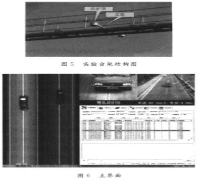为了验证基于线阵CCD的交通信息采集和检测系统的可靠性和实时性,对某省级公路进行检测实验。线阵CCD成像系统放置在道路上方,如图5所示,检测范围为同方向3个车道共11.25 m,对过往车辆能实时正确触发,车牌识别效果较好,测速较为准确,如图6所示。系统在运行过程中稳定可靠,实时性高,软件使用方便。