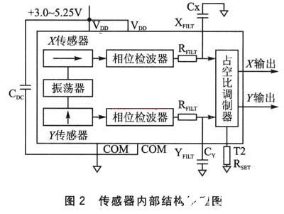 ADXL202传感器由振荡器,X、Y方向传感器,相位检波电路以及占空比调制器组成,具有数字输出接口和模拟电压信号输出接口。X、Y方向传感器是2个相互正交的加速度传感器,它们同时工作,可以测量动态变化的加速度和恒定的加速度。传感器之后级连相位检波器,主要是用来修正信号,并对信号的方向做出判断。检波器输出的信号,通过一个32 kΩ的电阻来驱动占空比调制器,通过在XFILT和YFILT引脚外接电容CX和CY来改变带宽。
