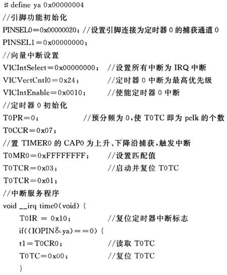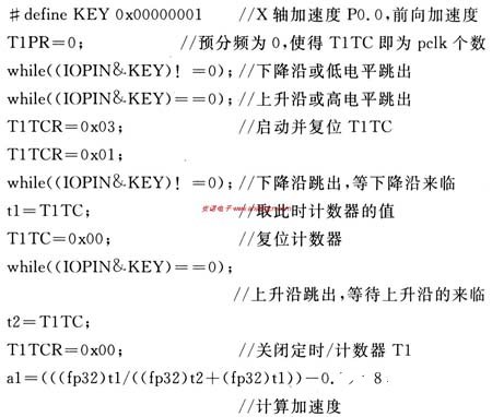 如图5所示,Yout与 LPC2103的PO.2引脚相接,利用P0.2的功能复用,可以实现定时器捕获中断方式接收传感器数据。主要程序段如下:
