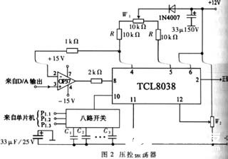 振荡器的振荡频率由图2中的定时元件R、C及控制电压决定。当R和C一定时,改变ICL8038的⑧脚电压可改变振荡器的振荡频率。实验表明,仅靠改变压控电压来改变扫频波的频率是不能满足测量要求的(频率范围太窄)。为了扩展频率范围,我们采用了分档切换电容的办法。电容C通过一电子开关接入,单片机根据扫频波的频率值自动给出相应的开关量(三位),从而选择所接入的电容值,可使扫频频率范围扩展到10Hz~1MHz。