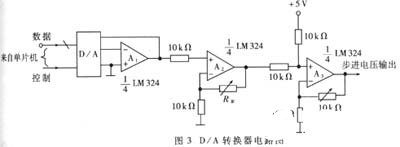 在频率特性测试仪的设计中,扫频信号源的质量具有重要的意义。无论是模拟式扫频仪,还是数字扫频仪,都要求扫频信号源具有线性压控的特性,且扫频波的输出幅度应是恒定的,不因频率或被测网络的改变而改变。为此,我们选用低线性误差的函数发生器ICL8038 1 构成压控振荡器,如图2所示。用D/A转换器提供控制电压。D/A转换器的输入数字量由单片机给出,如图3所示,可实现数字量的手动和自动调整。为了提高信号源的负载能力,我们将压控振荡器的输出信号送入一宽频带功率放大器,从而增大其驱动能力。关于宽带功放电路已有很多优秀的器件或电路可供选用,此处不再赘述。