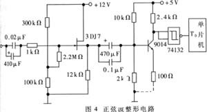 扫频波频率的测量与显示由单片机完成。宽带功放输出的正弦信号,经整形后送单片机供其测量并显示频率。用单片机完成这一任务已有较成熟的方法。值得注意的是测频的时间间隔不是固定的:数显时,时间间隔应较长(我们定为1s),因显示时必须延时一段时间才能便于观察;打印时,时间间隔较小(我们定为1ms),便于在较短时间内打印全频段数据。测频前信号的整形电路选用宽频带正弦波─矩形波变换电路?2?,如图4所示。场效应管源极跟随器的接入是为了消除变换电路对信号源的影响。