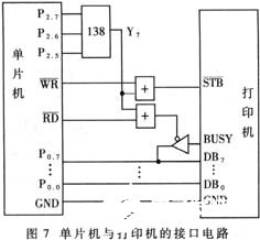 上述幅频与相频特性的测量对频率而言是离散的。某一时刻只能看到某一频率下的增益或相移。为了获得连续的频率特性曲线,我们将全段内各频率下的增益或相移存放在单片机的外部RAM中,将单片机与打印机相连,将存放在外部RAM中的数据逐个送打印机打印,取得较好的效果。单片机与打印机的接口电路如图7所示。DB0~DB7为单向数据传输线,单片机通过此传输线将待打印的数据送给打印机。STB为数据选通信号,此信号上升沿时,数据线上8位数据被打印机读入机内锁存并打印。BUSY为打印机的“忙”信号输出线,输出高电平表示打印机处于“忙”状态,此时,单片机不得向打印机送入新的数据字节。当BUSY为低电平时,单片机将存在外部RAM中的数据送给打印机。编制相应程序时,只要设置好打印机的控制字,并将增益或相移值作适当量化即可。