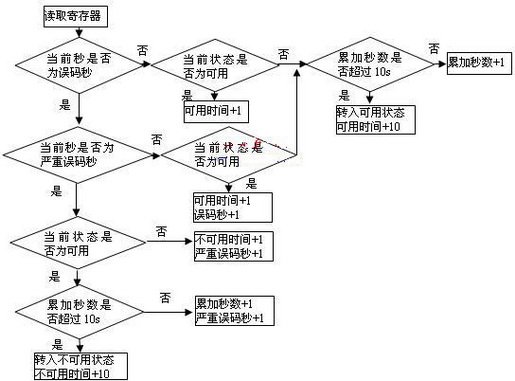 上述各项指标的测量由检测模块和语音监听模块实现,指标的(3)、(4)项可通过对ds21354和ds21372的相关寄存器的设置和对线路状态寄存器的读取并对数据简单处理可实现。指标的(5)、(6)项可通过对时隙交换电路相关寄存器的设置和读取对数据简单处理实现。第(2)项的指标参数是统计指标,需要在读取DS21372寄存器的原始测试数据之后,经过计算得到。统计指标以秒为单位,程序设置了周期为1s的中断定时读取ds21372的寄存器值,调用计算函数计算统计指标。图3是在G.821分析模式下的统计指标算法流程图,其余分析模式下与此相似。