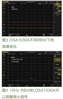 1. 采用全数字中频技术可以测量更小的信号:通过实现更小带宽的中频滤波器,大幅度降低了显示平均噪声电平。DSA1030A实现了最小10Hz的RBW,而要实现这么小带宽的模拟滤波器技术上是很困难的。如图3所示,当设置更小的RBW时,频谱仪的本底噪声也将相应降低(VBW都选择10Hz,同时扫描时间都选择自动),降低大小可以用公式(1)说明。如果RBW从10kHz修改成 1kHz,则底噪将下降10dB。DSA1030A在内部标配的前置放大器打开之后,选择10Hz的RBW,可以测量达-148dBm的信号,如图4。
