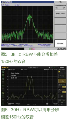 2.采用全数字中频技术可以分辨更近的信号:通过实现更小带宽的中频滤波器,可以分辨频率相差只有10Hz的两个信号。最小分辨率带宽是用来说明频谱仪能分辨两个幅度相当而频率相差很小信号能力的指标。越小的分辨率带宽就可以分辨距离越近的信号。例如输入一个两个频率相差150Hz的双音信号,使用30Hz的RBW可以轻易分辨,而3kHz的RBW则不能办到。图5和图6所示。分辨率带宽是指中频滤波器下降3dB处的带宽。