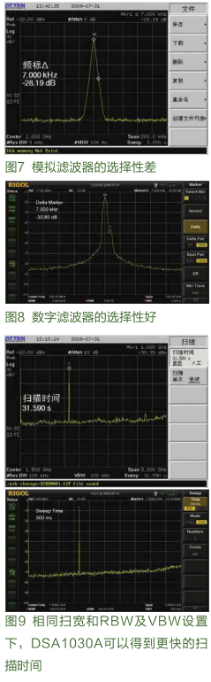 此外,数字滤波器的形状因子可以做得更小,从而以前被掩埋在大信号裙带下的小信号采用更好选择性的数字滤波器之后得以凸现。选择性是60dB带宽与 3dB带宽的比值。DSA1030A的中频滤波器选择性为5,远远优于模拟滤波器的15。如图7和8。采用数字滤波器的DSA1030A更容易分辨两个相距9kHz,幅度相差30dB的信号。
