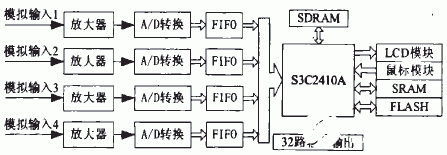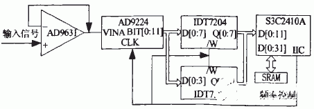 AD963l是一种低畸变、低噪声、高速运放。主要提高输入阻抗,减小外接阻抗变化的影响。模拟输入经AD9631处理后至AD9224,在S3C2A10A的控制下,系统产生可调频率方波接为AD9224和IDT7204的工作信号。AD9224开始对输入信号进行模数转换.同时转换输出的数字信号保存到相应的FIFO中。FIFO存满时,S3C2410A通过DMA通道将多路FIFO中的数据依次存放到SRAM中的固定地址区域。
