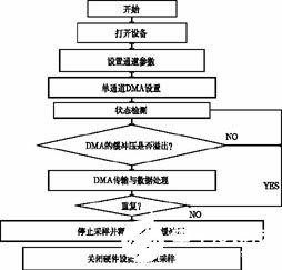 在进行频稳测量时,由于处理数据量大,而且要求很高的采集率,所以采取DMA传输方式。图2是硬件驱动模块与数据采集模块相结合实现数据采集流程图。