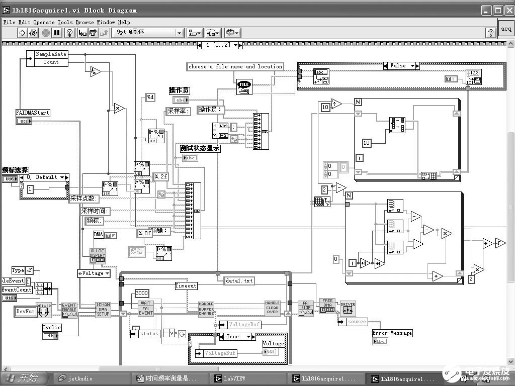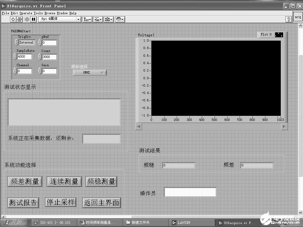 LabVIEW程序由三部分构成,即前面板、图形代码及程序图标(即函数模板)和接口板。该部分即为前面板,它实现程序的输入和输出功能,由控制键元素和显示键元素构成。控制键代表程序的输入参数,显示键代表程序的输出值。图3是该系统的主程序界面,左上角接受用户输入的测量参数;左下角是各种功能键,包括频差测量、连续测量、频稳测量、测试报告、停止采样等;右上角是实时数据显示,可以看出数据变化的趋势;右下角则是频稳、频差等的计算结果显示。