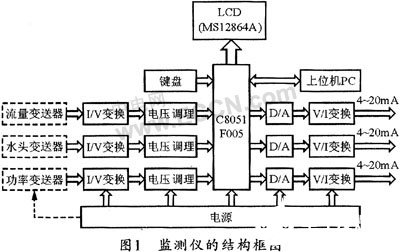 该监测仪中CPU所选用的C8051F005内部程序存储器包含32 k+128字节的FLASH,可在线编程调试。三路变送器产生的4~20 mA的电流同时送人监测仪后。可经过I/V变换转换成0~5 V的直流模拟电压。电压经过调理后(0~2.4 V)送入C805F005,并利用其内部的12位ADC对模拟电压进行数字化并测量,然后经过CPU计算并将产生的结果同时显示在LCD上。考虑到系统的线性度要求,本设计采用三路独立的D/A产生模拟信号并经过V/I变换后输出。计算中用到的参数可以预先写入并由按键手动修改。电源部分除为监测仪内部各个芯片供电的同时,还要为三路变送器供电(具体电压电流视实际情况而定)。该监测仪的结构框图如图1所示。