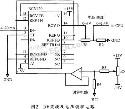 系统I/V变换采用的R CV420芯片是美国RURR-BROWN公司生产的精密电流环接收器,用于将4~20 mA输入信号转换成0~5 V输出信号。该芯片具有很高的性能价格比,它包含一个高级运算放大器、一个片内精密电阻网络和一个精密10 V电压基准,其总转换精度为0.1%,共模抑制比CMR达86DB,共模输入范围达40 V。RCV420在满量程时的电压降仅为1.5 V,故在环路中串有其它仪表负载或在对变送器电压有严格限制的应用场合非常有用。但在实际使用中要注意对RCV420的调零,否则RCV420在输人4 mA时可能产生微弱的输出,这会影响系统的线性度和准确度。由于C8051F005内置的12位ADC采用内部参考电压(REF0CN=0x07)时的满度电压为2.4 V,所以RCV420的输出要经过电压调理。而由于单片机的阻抗很大,该调理电路应采用电阻分压方式,调理过程产生的微小误差可以通过软件进行补偿。具体应用及调理电路如图2所示。