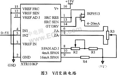 V/I变换电路可选用BURR-BROWN公司生产的精密电压电流转换芯片XTR110来进行设计。该转换芯片可以把接收到的0~5 V或0~10 V的直流模拟电压转换成4~20 mA、0~20 mA或5~25 mA的直流电流。本设计应用的是第一种转换方式,即将0~5 V范围的电压信号转换成0~20 mA的电流信号。事实上,XTRR110芯片内置精密的电阻网络和10V参考电压,最大线性误差为0.005%。输出采用P沟道MOS场效应管,本设计使用的是IR公司的IRF9513,若使用其它场效应管.则应满足的最大耐压值为:BVDSS=80 V,BVGS=40 V。具体电路如图3所示。