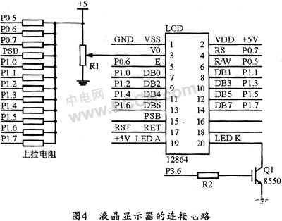 本监测仪的显示部分是采用12864的图形点阵液晶显示模块MS12864A的设计。该模块自带驱动电路和汉字库,可与MCU进行8位并行连接。使用该模块可以同时显示所要监测的多路参数而不用切换。由于C8051F005的引脚电压为3.3 V,所以需要外接上拉电阻以驱动液晶模块,其具体连接电路如图4所示。