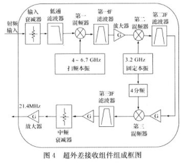 组件采用三级混频方式实现,第一中频4 021.4 MHz,第二中频821.4 MHz,第三中频21.4MHz,这样选择的目的是第三混频需要的800 MHz本振可以由第二混频需要的3.2 GHz本振4分频产生,从而减少了本振数量,降低了体积。