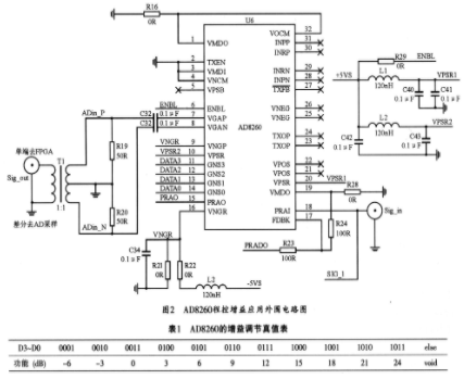 图2所示是AD8260的外围电路,其中AD8260芯片采用±5 V双电源供电,也可以通过跳线实现+3.3V单电源供电。即将-5VS接地,R21焊接,R22断路,+5VS接+3.3 V。
