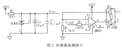 传感器模块采用PT一100型热敏电阻,其阻值随温度升高而升高,PT-100加恒流源,其测量温度范围受PT一100耐温的影响.范围为一50℃~620℃。PT一100是一个前端为金属,后端为导线的热敏电阻,若将其包裹防腐蚀、耐高温材料,则可将作为探头探进高温熔炉、低温冰窖,实现温度测量。PT-100热敏电阻自带两根导线,将其两线改成四线制测量,可有效消除引线电阻(即将传感器的信号传到远方二次仪表之间的连接导线或电缆)影响,使测量结果更准确。图2为传感器前端接口电路,通过调节器TL43l给电路中的恒流源提供基准电压V-ref为2.49l V(基准电压范围为2.440~2.550 V)。这里选取2.491 V电压,便于后续数字量计算。将基准电源接至放大器0P07,为PT-100提供恒流源。