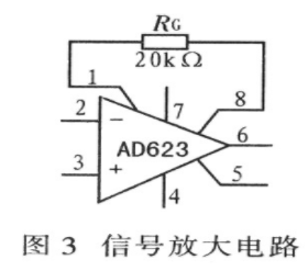 探针式智能温度控制仪采样模块主要是由基准器件A/D转换器AD623和AD7705组成,由于所采集的温度传感器电压为毫伏级,所以需通过具有放大功能的AD623完成,其电压放大倍数由RC决定,放大倍数G=(100 kΩ/RG)+1。由于传感器输出电压为80~320 mV,基准电压2.491 V,故选取RG为20 kΩ,则放大倍数G≈6。经运放放大,其输出电压信号为0.48~1.92V,完全满足输入电压不高于基准电压的要求。图3为信号放大电路。