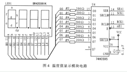 如图4所示,在单片机和LED显示之间接入一串入/并出的锁存器74HC595,驱动LED灯。单片机I/O接口控制4个LED数码管的位选,利用三极管的饱和、截止特性。数码管通过4根位选线与接三极管相连。单片机I/0接口向移位寄存器逐位移入8位二进制数,在上升沿信号时,存储器移入1位二进制数。存满后,单片机控制存储器输出8位二进制数,点亮对应数码管,这样可减少单片机资源消耗。